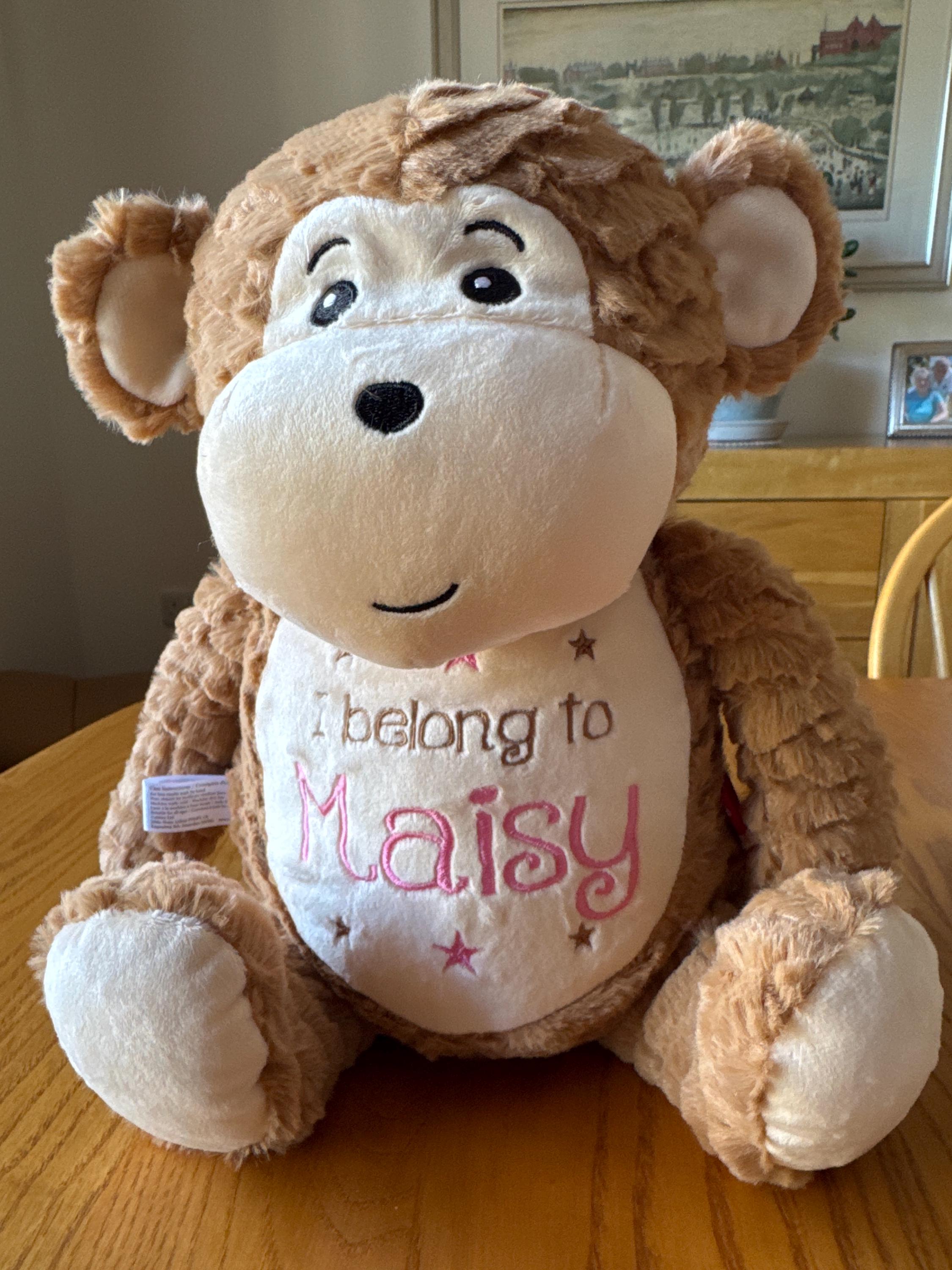 Absolutely delighted with my personalised monkey. Quick delivery, great price for product, beautifully personalised and fantastic communication from seller. Would 100% buy again